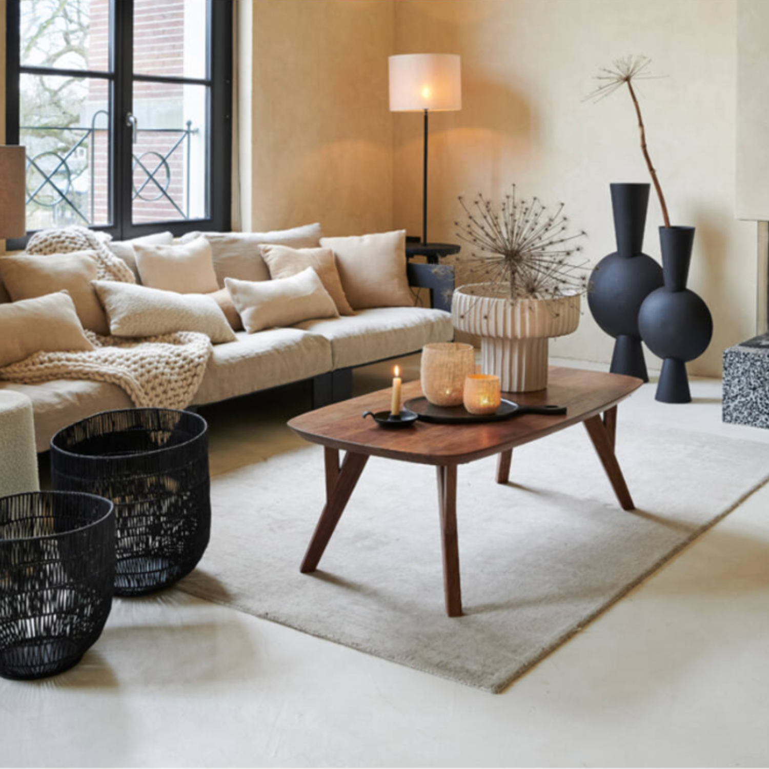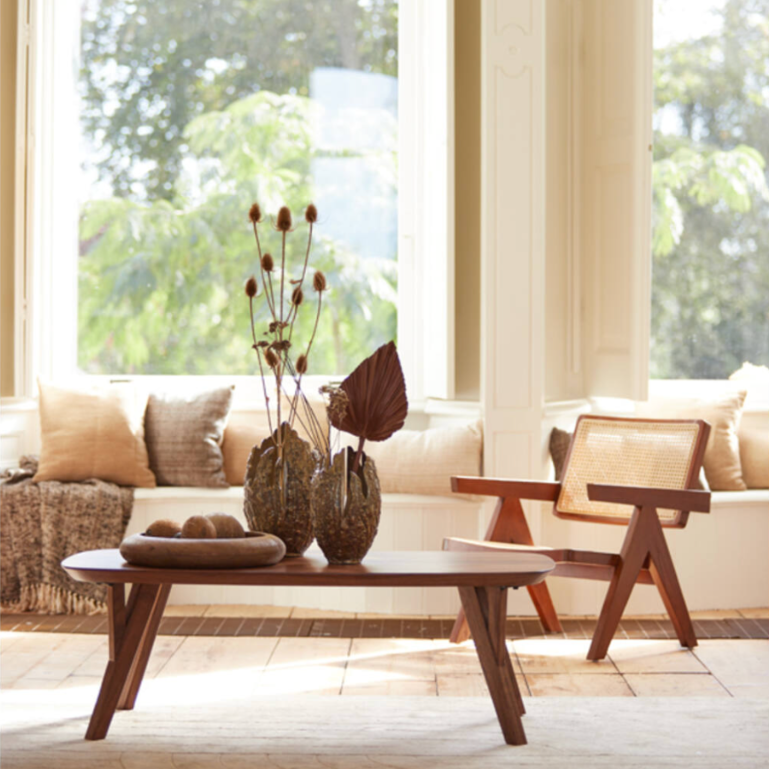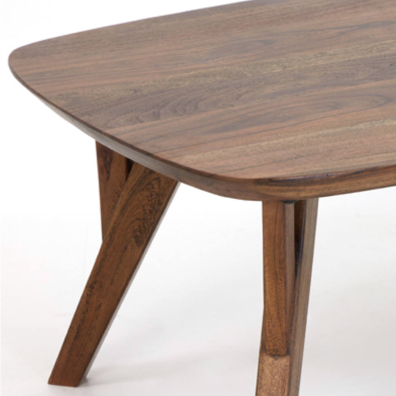 The Midcentury Panama Coffee Table – Dark Walnut is defined by its clean lines, softened edges and gently angled legs, creating a relaxed yet considered silhouette. Crafted from solid wood, its elongated oval top offers generous surface space while maintaining a light, understated presence within a setting.