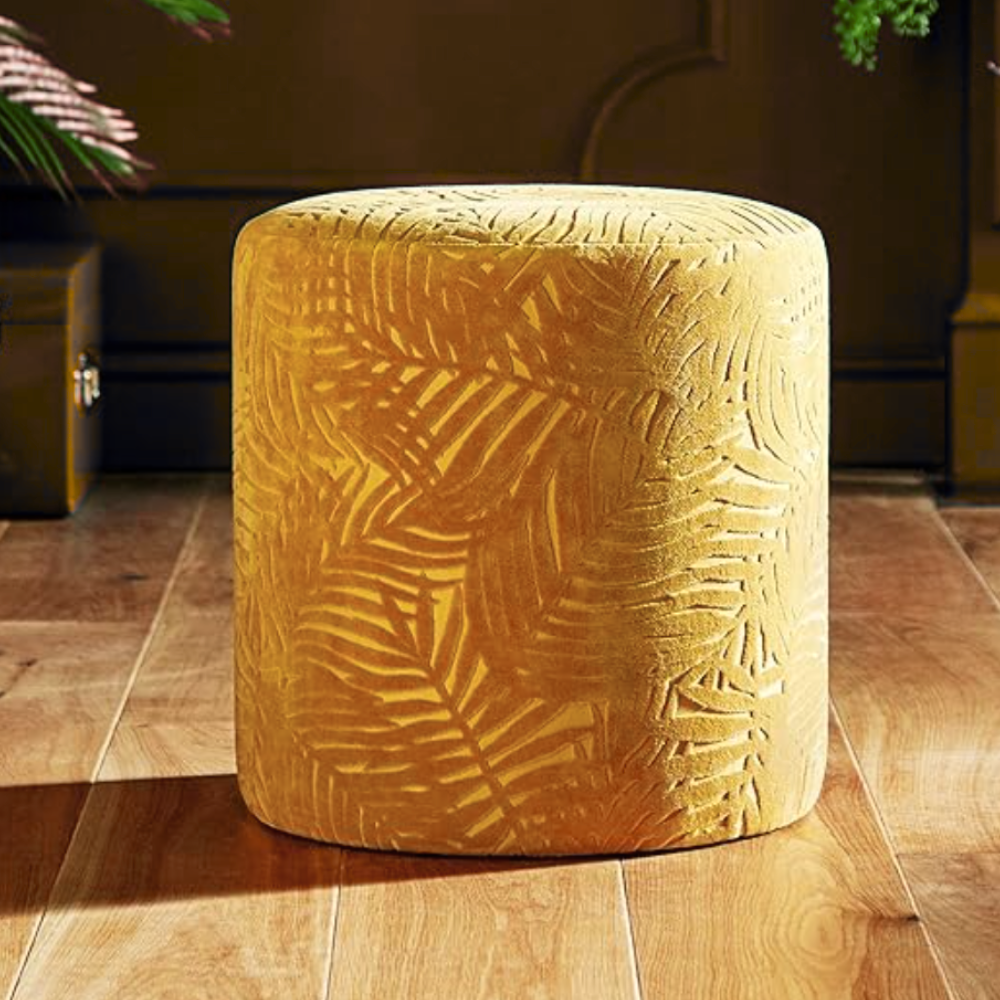 Our Mustard Palm Velvet Ottoman is a versatile accent piece for lounge areas and relaxed seating setups. Upholstered in mustard velvet with a subtle palm-inspired embossed pattern, it adds gentle texture and warmth without overwhelming a space.