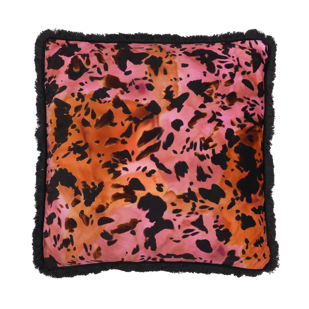 The feather filled Paoletti Colette Velvet Cushion Cushion channels the glamour of vintage cocktail bars and silver screen starlets. Swirls of molten amber and blush melt into inky, high-contrast markings, a rich, tortoiseshell-inspired print that feels both nostalgic and daringly modern. The soft black fringe trim adds that final touch of theatrical flourish