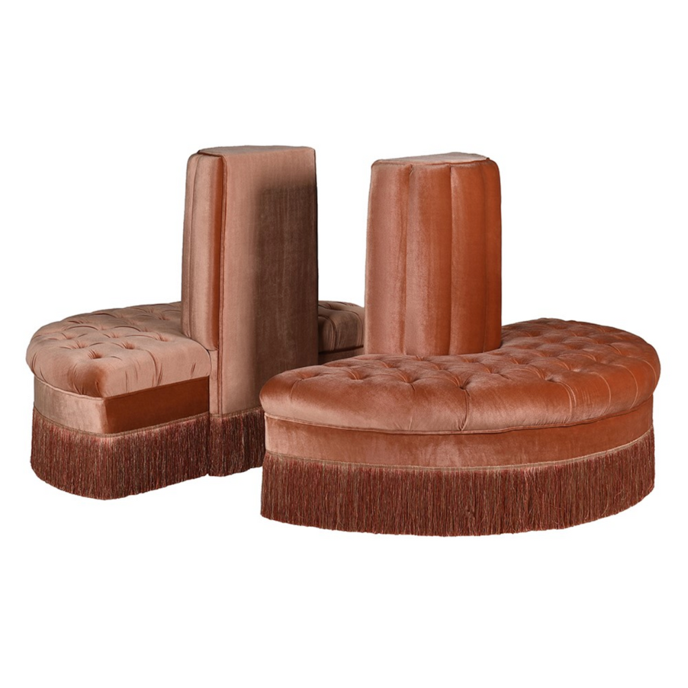 Upholstered in a plush and gentle amber hue, The Peachy Love seat is a versatile banquette, that can be used to compliment a large array of spaces. Soft velvets, and draping tassels make this a stand out feature in any event space. This seat also comes in two halves, so although you can place them together to make one large seat, they can also work separately, blending in seamlessly against a wall.